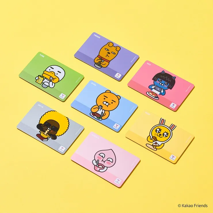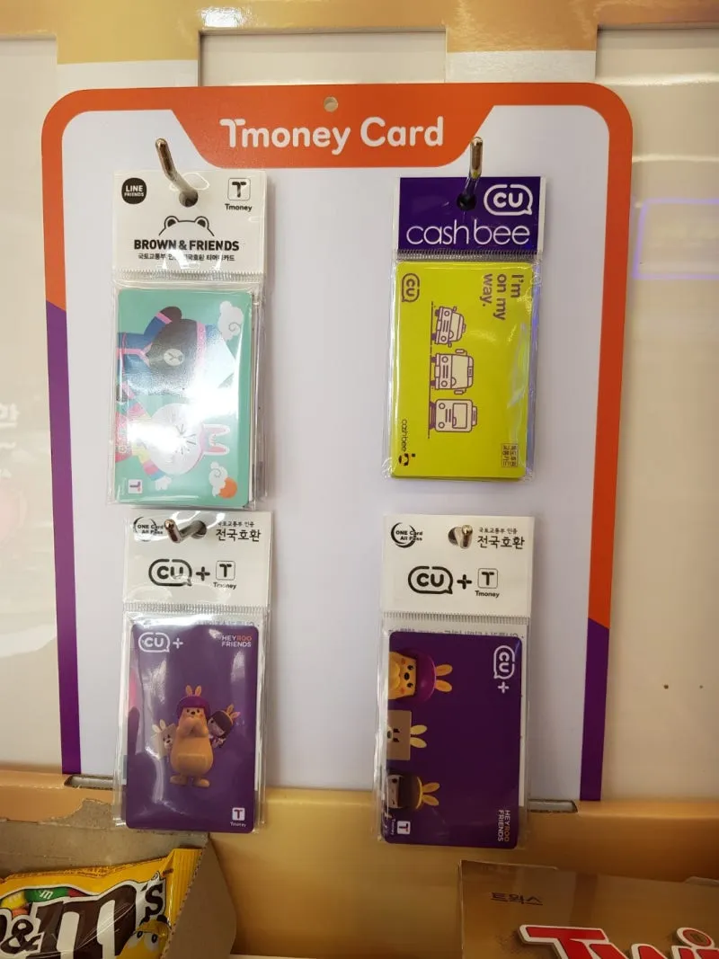 Walk into a convenience store. They're hanging right next to the counter. CU, GS25, 7-Eleven — doesn't matter which. Five or six cards on hooks under the fluorescent lights. Grab one, set it on the counter. Basic cards ₩3,000–4,000. Kakao Friends character ones ₩4,000–5,000. Say "T-Money please" and they'll know what you mean.