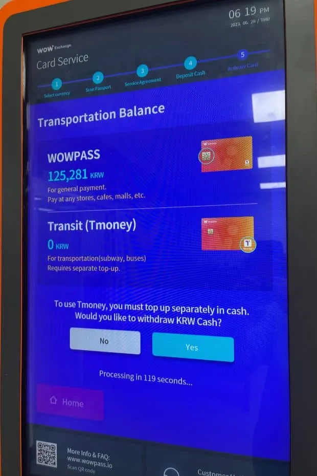 - Option A — Find a subway top-up machine (blue kiosk). Place your WOWPASS on it, insert ₩10,000–20,000 in cash. Hit "Transit Card Top-up." Done.